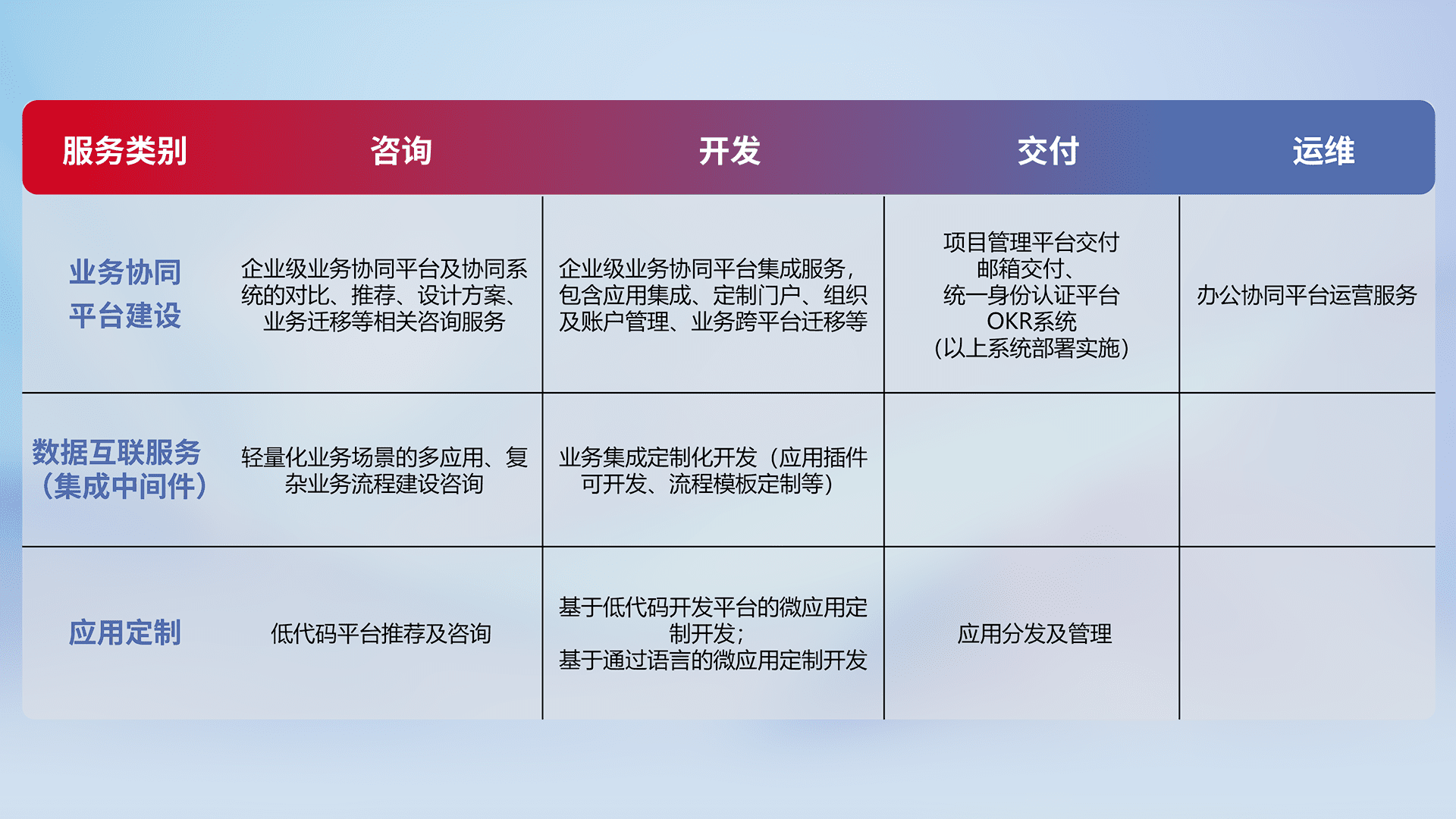 针对钉钉、、、、企微、、、、IDaas等平台级产品提供产品的规划、、、、方案、、、交付、、定制化开发等服务,,实现如统一协同办公、、智能客户服务、、混合会议管理、、、智能数据查询、、、、等业务场景,,,,实现数字化转型。。。。