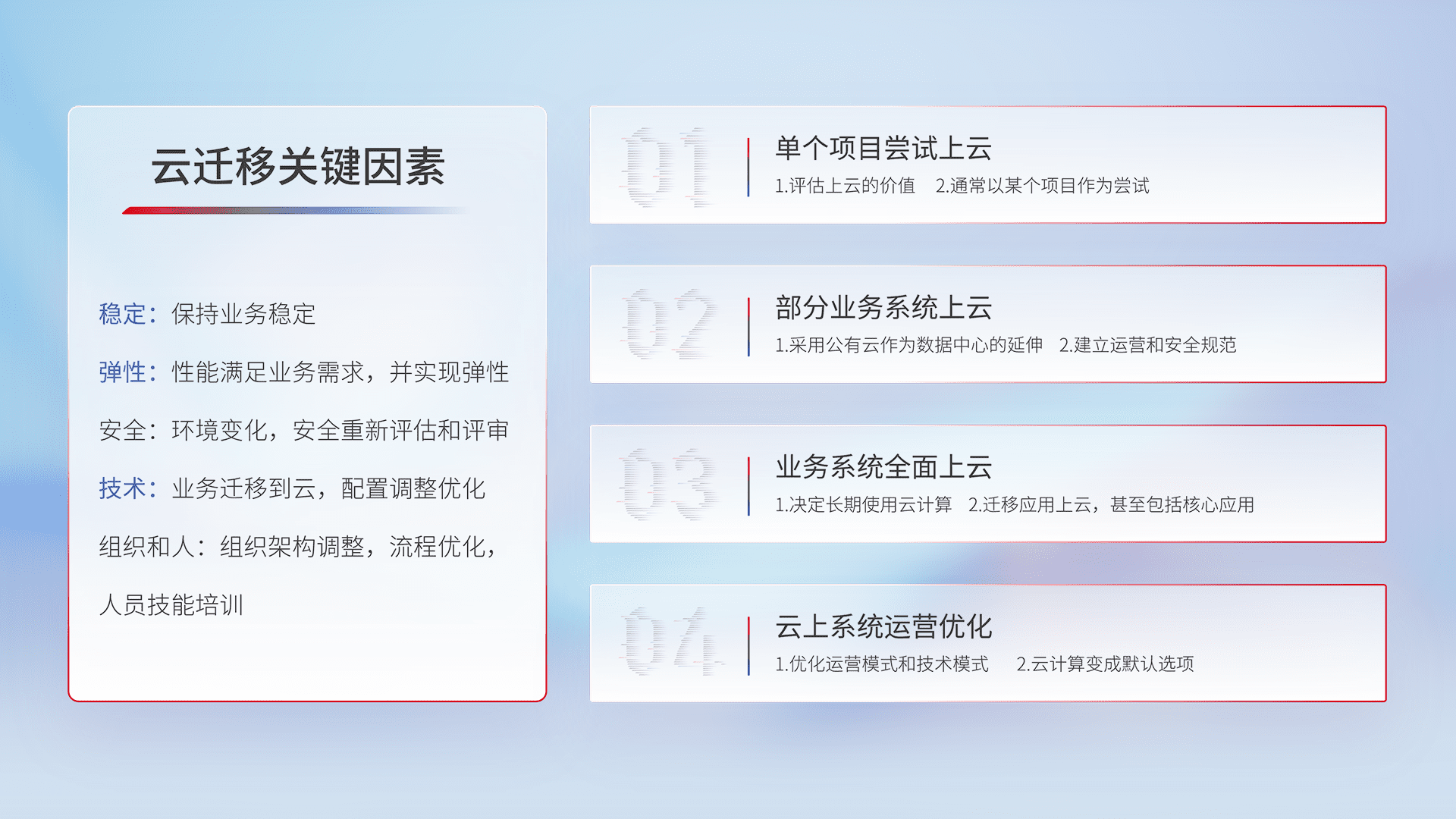 结合实际业务,,,从规划设计、、、、云平台选型、、、云原生改造、、、、数据迁移、、、、集成交付,,,,迁移全过程为客户识别最佳上云路径,,做好风险识别管理,,,,设计网络架构、、、身份权限、、安全审计合规、、、、操作审计、、、日志审计、、、监控告警策略、、、、多站点容灾设计等,,,对云上基础设施进行整体规划,,,提升IT治理水平,,,,以满足弹性、、、、高可用、、、高性能的需求。。。