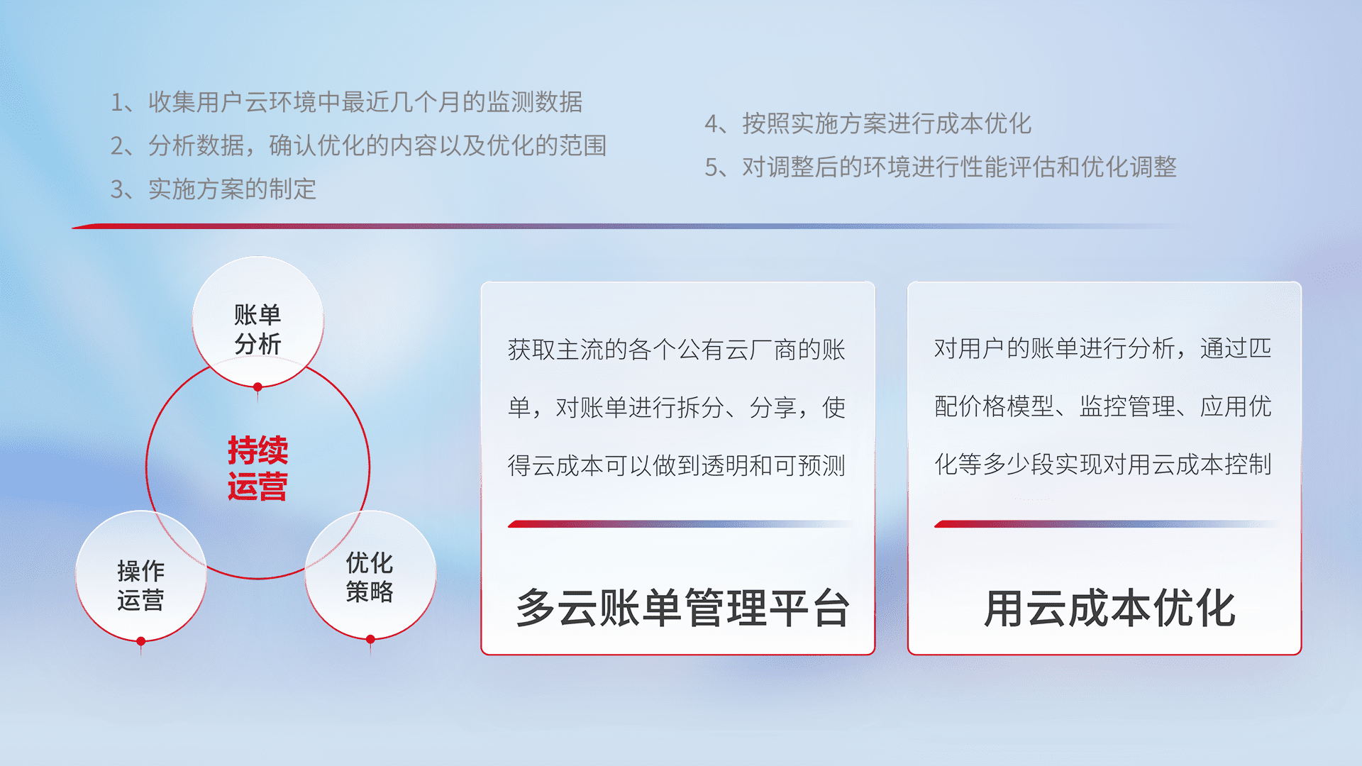 通过多云纳管,,,,以统一的资源数据模型把客户的云资源进行抽象和封装,,,,进而实现对多云资源的统一操作,,,保障云资源管理的可靠性、、稳定性与可用性。。。量身定制化运维内容,,配置、、、、开发运维、、补丁管理、、备份、、、监控、、认证和访问管理、、、、审计和日常巡检等,,,保障在用云过程中的可靠度,,稳定度以及高可用率。。。。